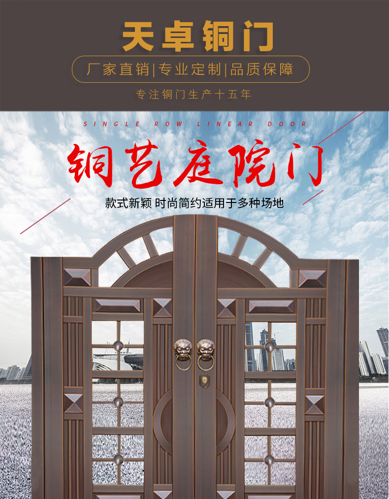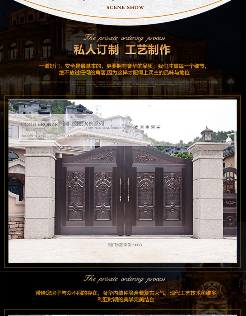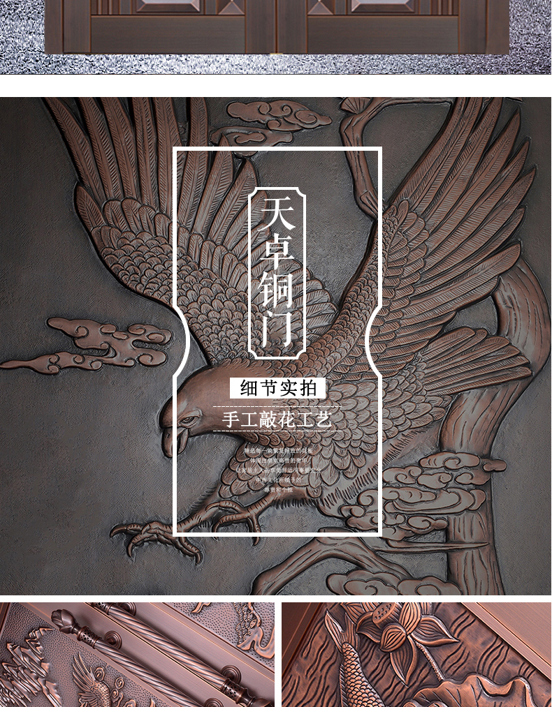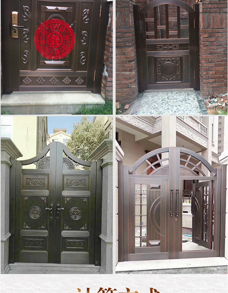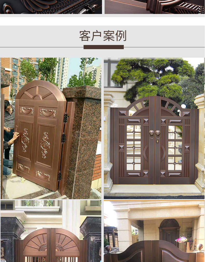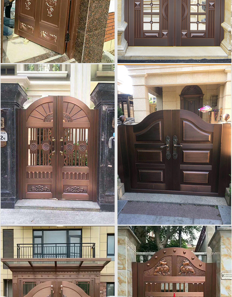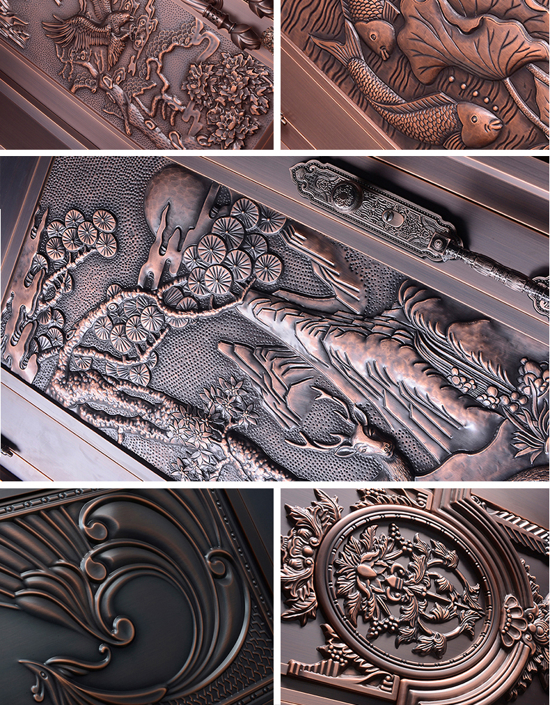 一道好的庭院門,安全是最基本的品質,其次更要擁有華麗的裝飾效果,西安天卓私人訂制中式庭院銅門,注重每一個細節,絕不放過任何的角落,采用十二道工藝匠心制作,因為這樣才配得上買主的品味與地位。帶給您與眾不同、無與倫比的的感覺,奢華內斂種隱含著復古大氣,現代工藝技術與維多完美結合。