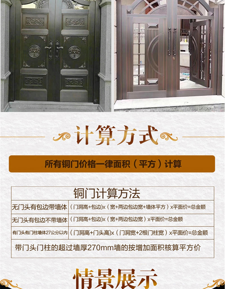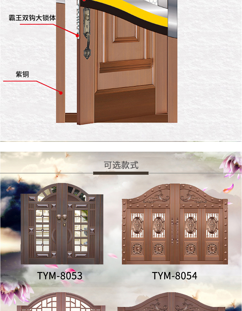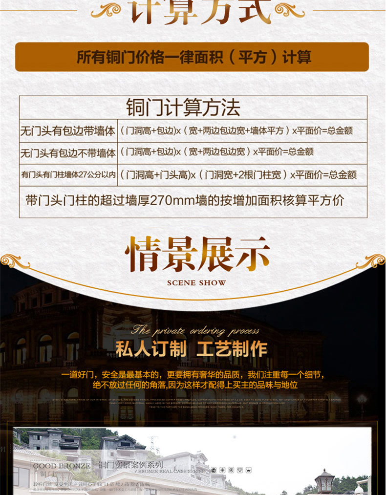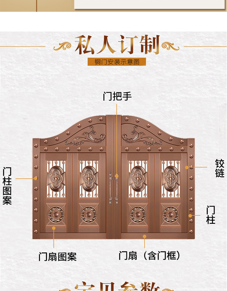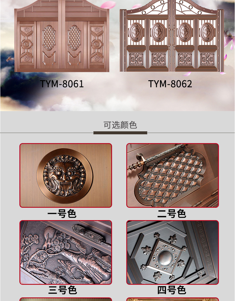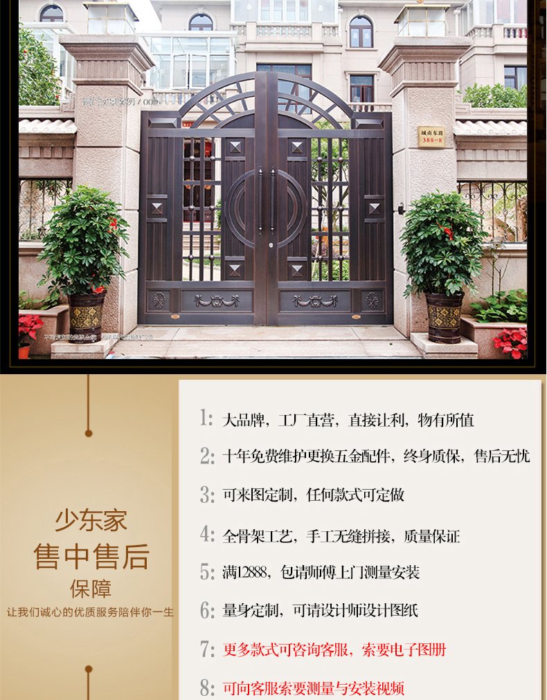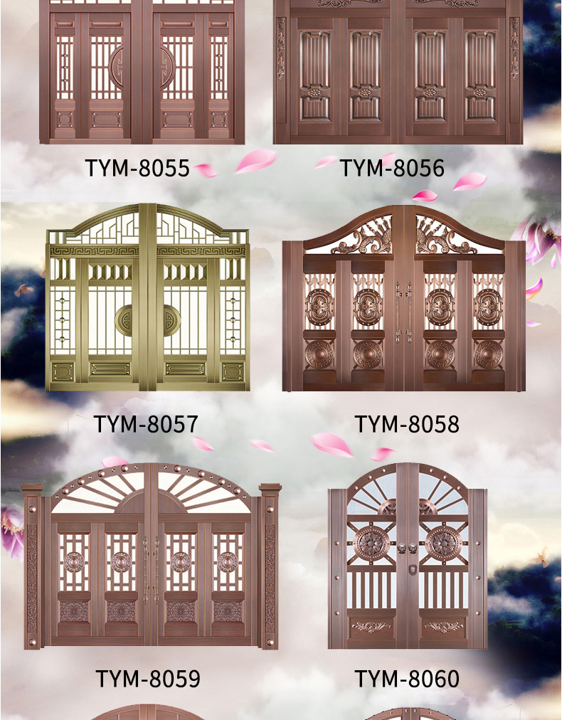 一道好的庭院門,安全是最基本的品質,其次更要擁有華麗的裝飾效果,西安天卓私人訂制中式庭院銅門,注重每一個細節,絕不放過任何的角落,采用十二道工藝匠心制作,因為這樣才配得上買主的品味與地位。帶給您與眾不同、無與倫比的的感覺,奢華內斂種隱含著復古大氣,現代工藝技術與維多完美結合。